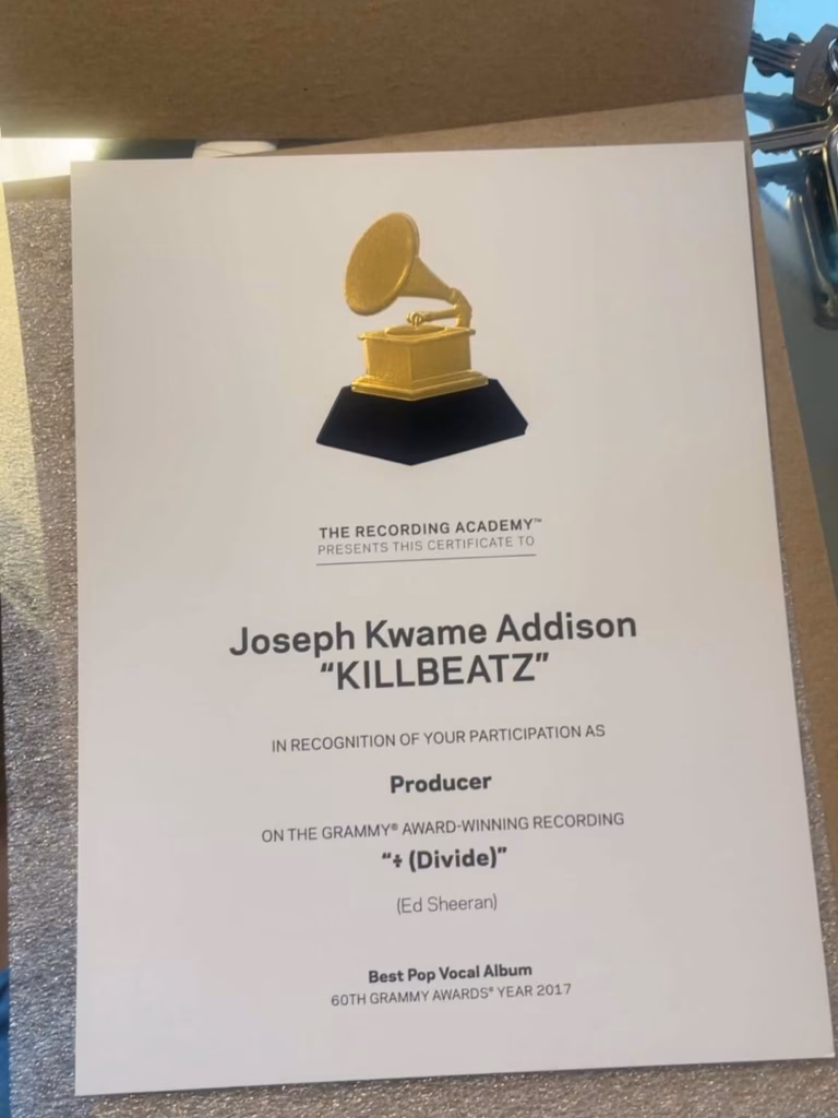 Ghanaian music producer Killbeatz has been honoured with a Grammy plaque in recognition of his contribution to Ed Sheeran’s award-winning album ÷ (Divide), marking a proud moment for Ghana’s music industry.