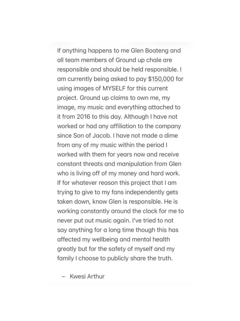 In the post, Kwesi Arthur specifically named Glen Boateng and other members of the Ground Up Chale team, stating that they should be “held responsible” if any harm comes to him. His remarks raised serious concerns among fans and industry observers, particularly due to the tone of fear and distress expressed in his message.