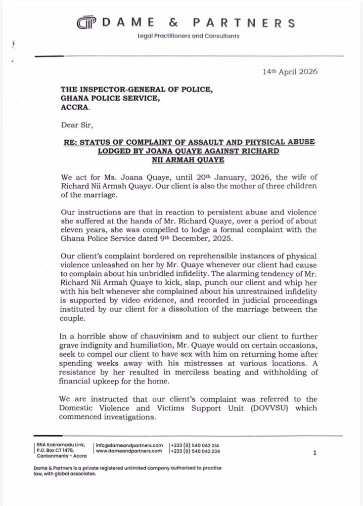 In a letter dated April 14, 2026, lawyers representing Joana Quaye detailed claims of persistent domestic violence, which they say occurred over an eleven-year period. According to the legal team, the situation escalated to the point where their client was compelled to lodge a formal complaint with the police on December 9, 2025.