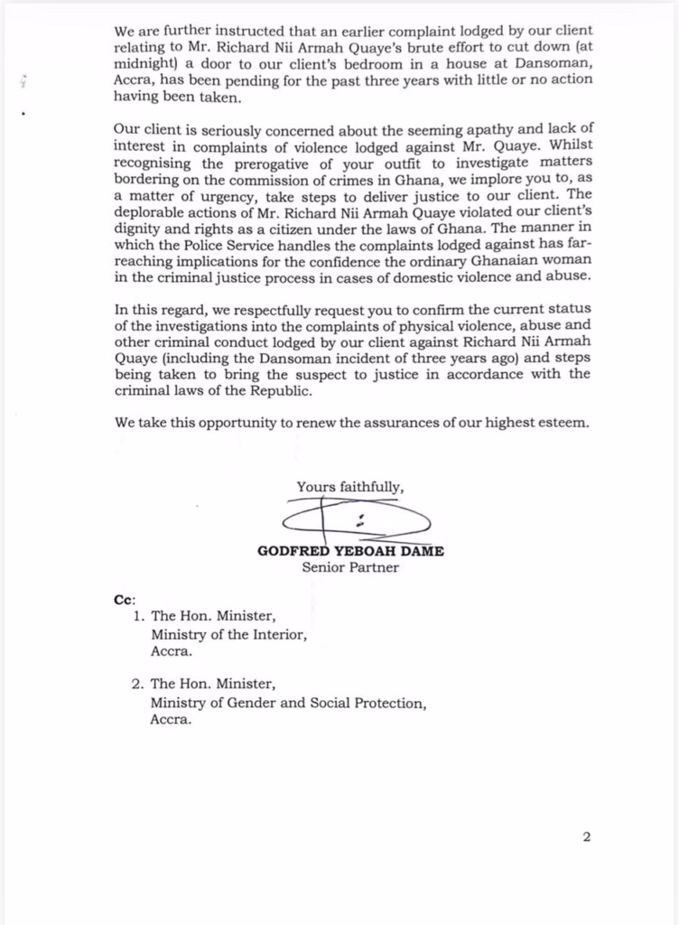 The complaint also highlights concerns about delays in previous police action. Joana Quaye’s legal representatives referenced an earlier report involving an alleged incident at Dansoman in Accra, where Mr. Quaye is said to have attempted to forcibly break into his wife’s bedroom. According to the lawyers, that case has remained unresolved for approximately three years.
