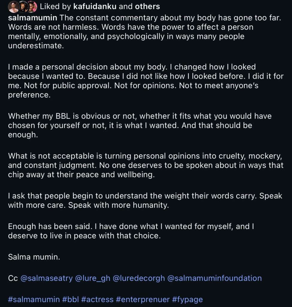 Ghanaian actress and social media personality Salma Mumin has broken her silence following persistent public commentary and criticism about her body, describing the ongoing scrutiny as excessive, harmful, and emotionally distressing.
