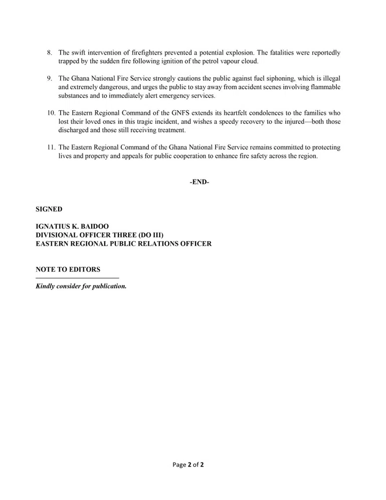 The GNFS emphasised that the swift intervention of firefighters prevented what could have been a far more catastrophic explosion. The Service strongly warned against illegal fuel siphoning, describing it as both unlawful and extremely dangerous.