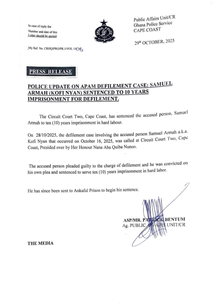 The case was heard at Circuit Court Two in Cape Coast, presided over by Her Honour Nana Aba Quiba Nunoo. During proceedings, Armah pleaded guilty to the charge of defilement and was convicted on his own plea, leading to an immediate 10-year jail sentence with hard labour.