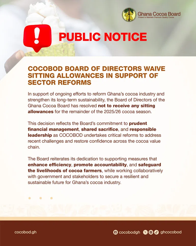 “This decision reflects the Board’s commitment to prudent financial management, shared sacrifice, and responsible leadership as COCOBOD undertakes critical reforms to address recent challenges and restore confidence across the cocoa value chain,” the notice added.