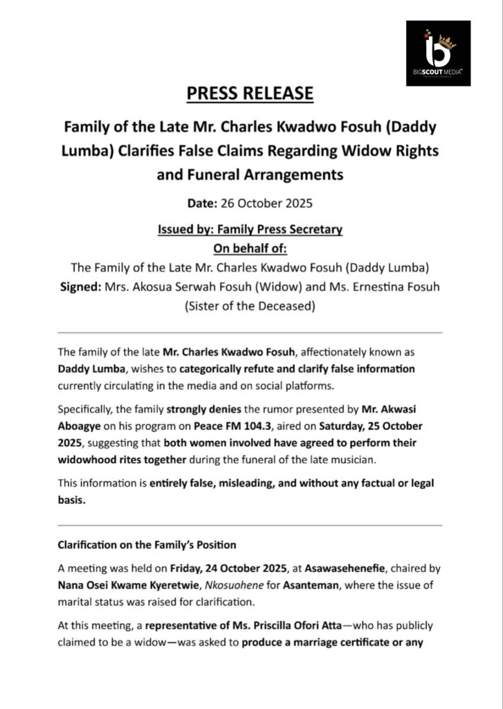 According to the statement, a family meeting was held on October 23, 2025, during which Odo Broni was asked to provide proof of marriage to the late musician by presenting a valid marriage certificate. However, she was reportedly unable to produce such documentation.