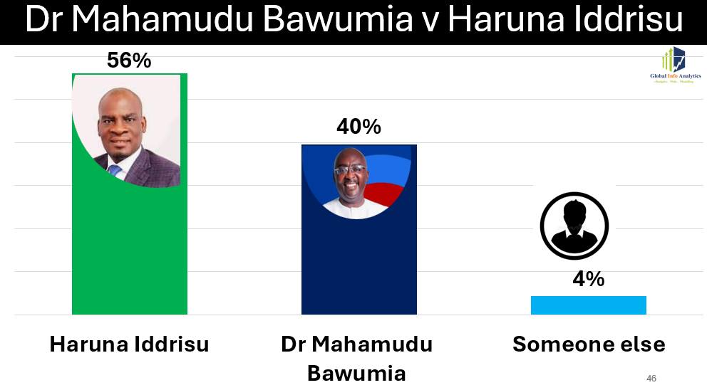 Education Minister and Tamale South MP Haruna Iddrisu emerges as one of the NDC’s most formidable contenders. Global InfoAnalytics polling shows him defeating Dr Bawumia by 56% to 40%, a commanding 16-point margin.