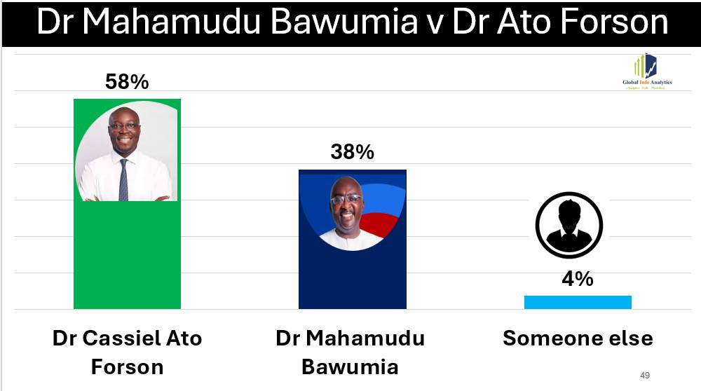 Finance Minister Dr Cassiel Ato Forson emerges as the strongest NDC challenger in polling terms. He leads Dr Bawumia by a wide margin of 58% to 38%, the largest gap recorded among all contenders.