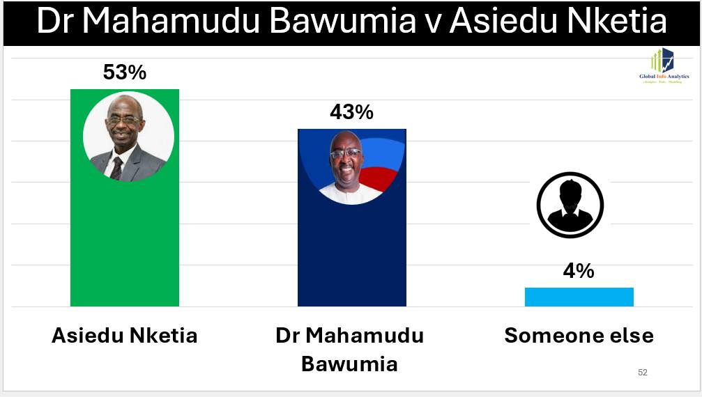 NDC National Chairman Johnson Asiedu Nketiah also performs strongly, defeating Dr Bawumia by 53% to 43% in head-to-head polling. His advantage lies in deep grassroots networks, organisational discipline, and decades of political experience.