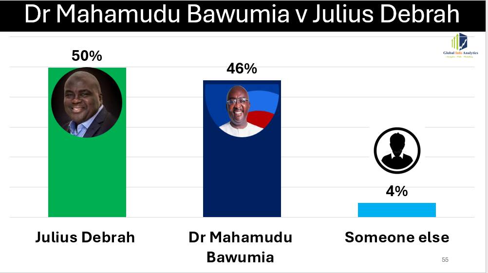 Chief of Staff Julius Debrah records the narrowest projected win against Dr Bawumia, with a 50% to 46% margin. Though his internal party support remains modest, typically between 6% and 11%, his national appeal suggests broader voter confidence in his administrative competence and governance experience.