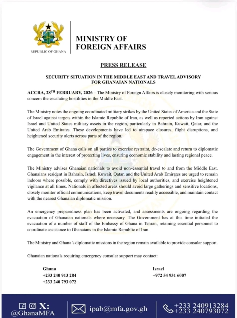 Citizens were also advised to maintain regular contact with the nearest Ghanaian diplomatic mission and to avoid non-essential travel to and from the Middle East until further notice.