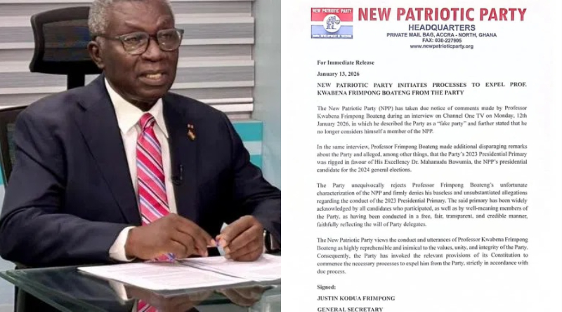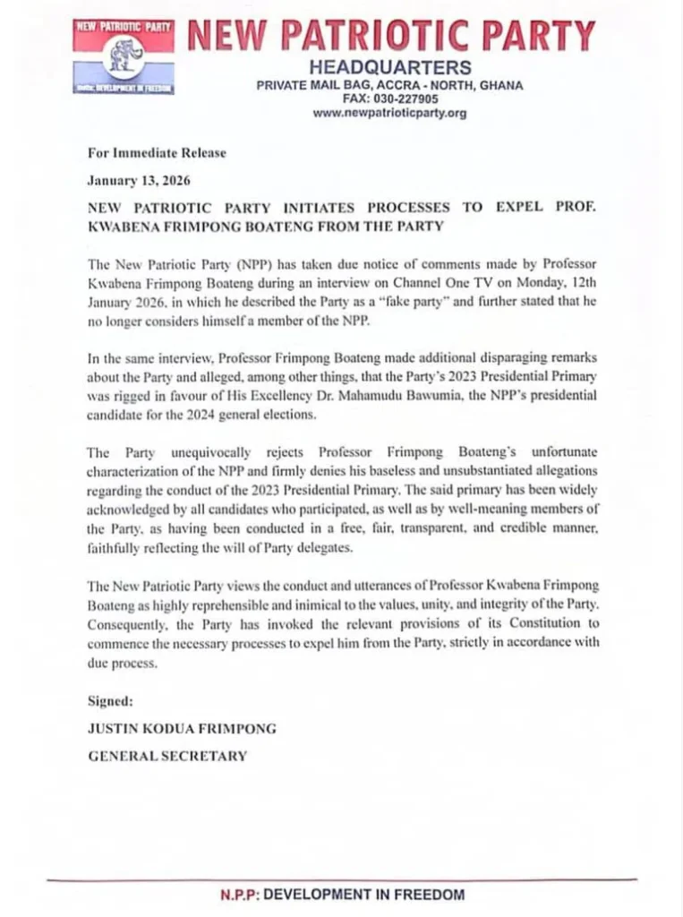 The New Patriotic Party (NPP) has officially begun formal procedures to expel former Environment Minister, Prof Kwabena Frimpong-Boateng, following comments he made describing the party as a “fake party” and alleging irregularities in its 2023 Presidential Primary.