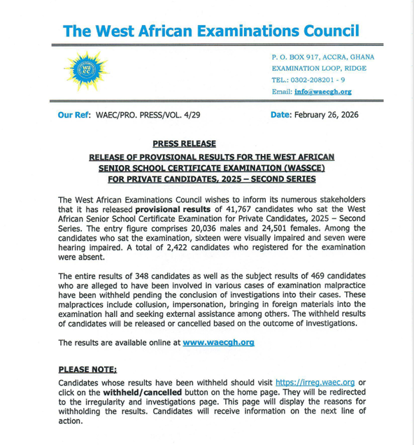 According to the Council, the affected results will either be released or cancelled after investigations are completed. WAEC emphasized that due process will be followed before any final decision is taken.