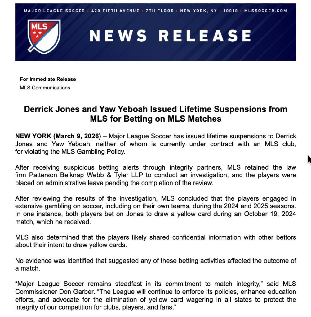 The league announced the sanction on March 9, 2026, following a probe into suspicious gambling activity during the 2024 and 2025 MLS seasons.